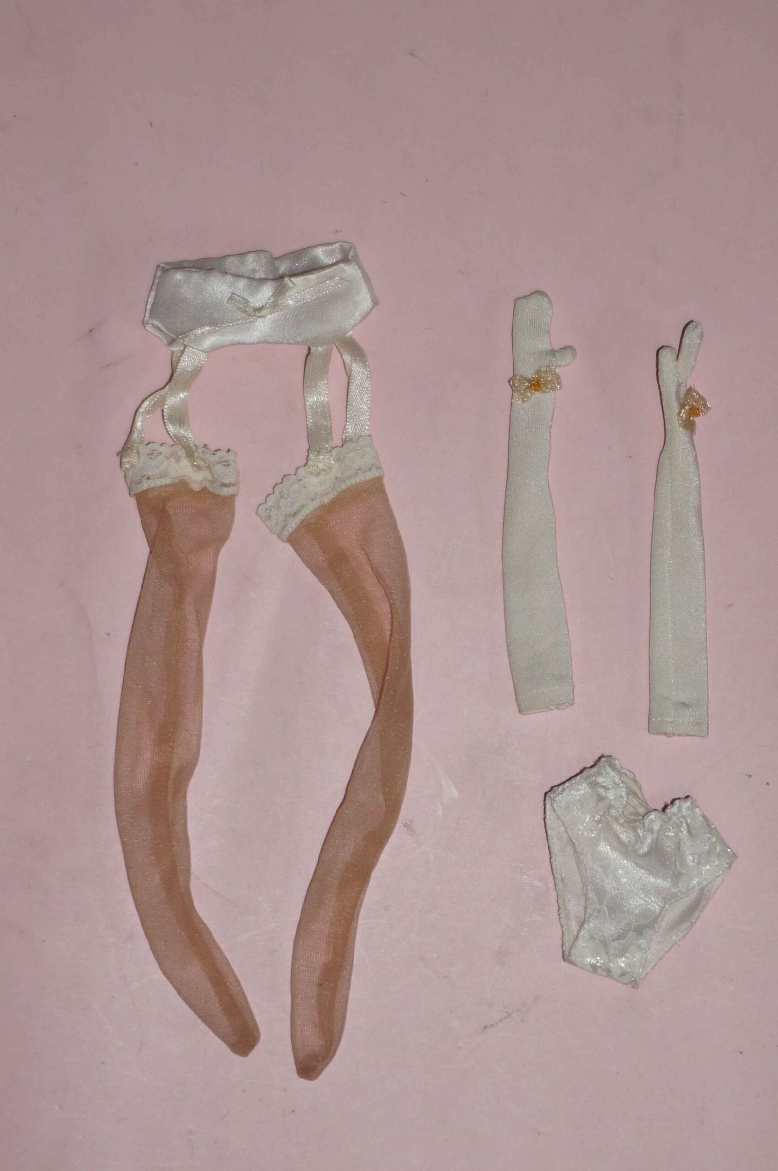 White underwear set with stockings and gloves, fits most 16 inch dolls.