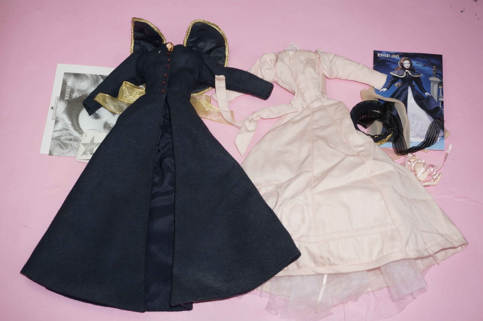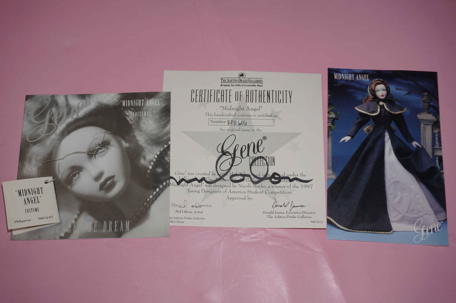 Beautiful and Gene outfit with black and gold coat, off-white gown and matching accessories; excellent used condition, includes certificate, which is hand-signed by Gene’s creator Mel Odom. For 16″ Gene Marshall dolls and similar.