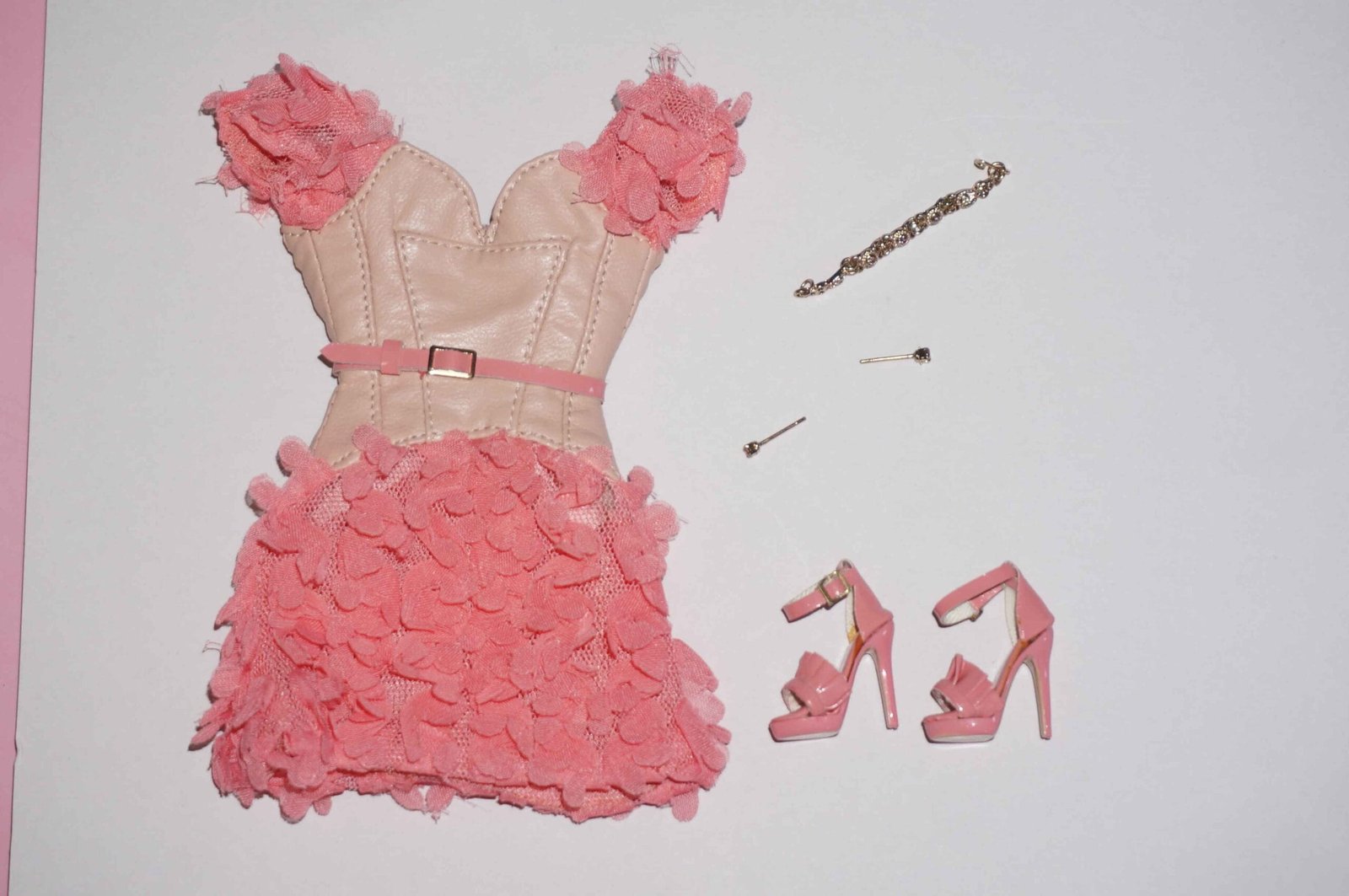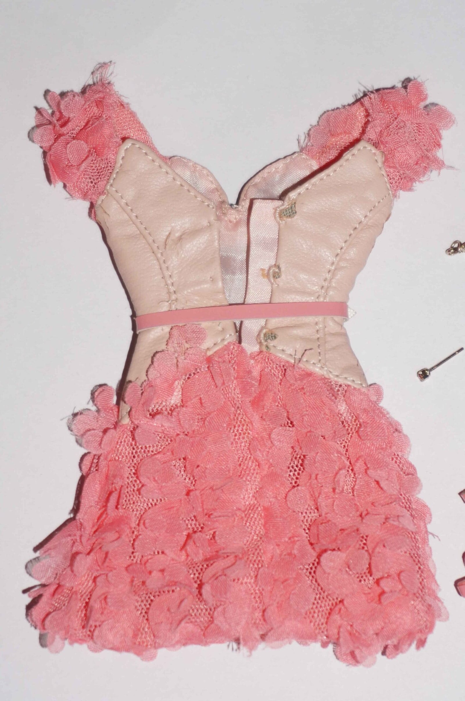 Extremely rare fashion set from the Nadja Rhymes Sweet Dreams doll, 2017 release from the Fashion Fairytale Convention. This is the pink dress, shoes and acessories only. The dress has some mild leather wear to the back and otherwise everything is in good condition. This fits 12 inch dolls like Nu Face and Fashion Royalty.