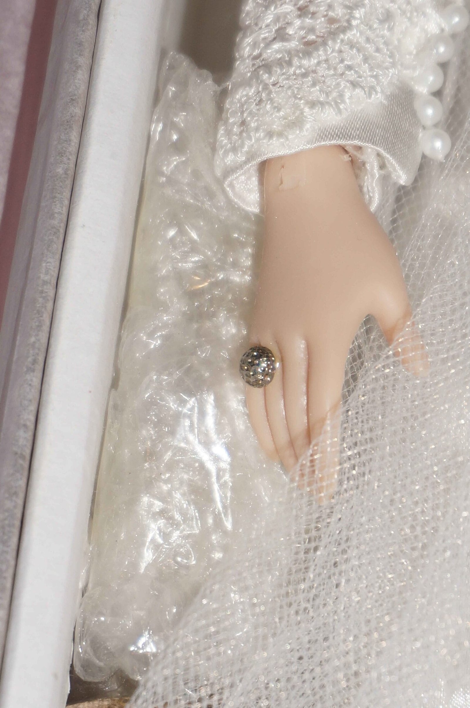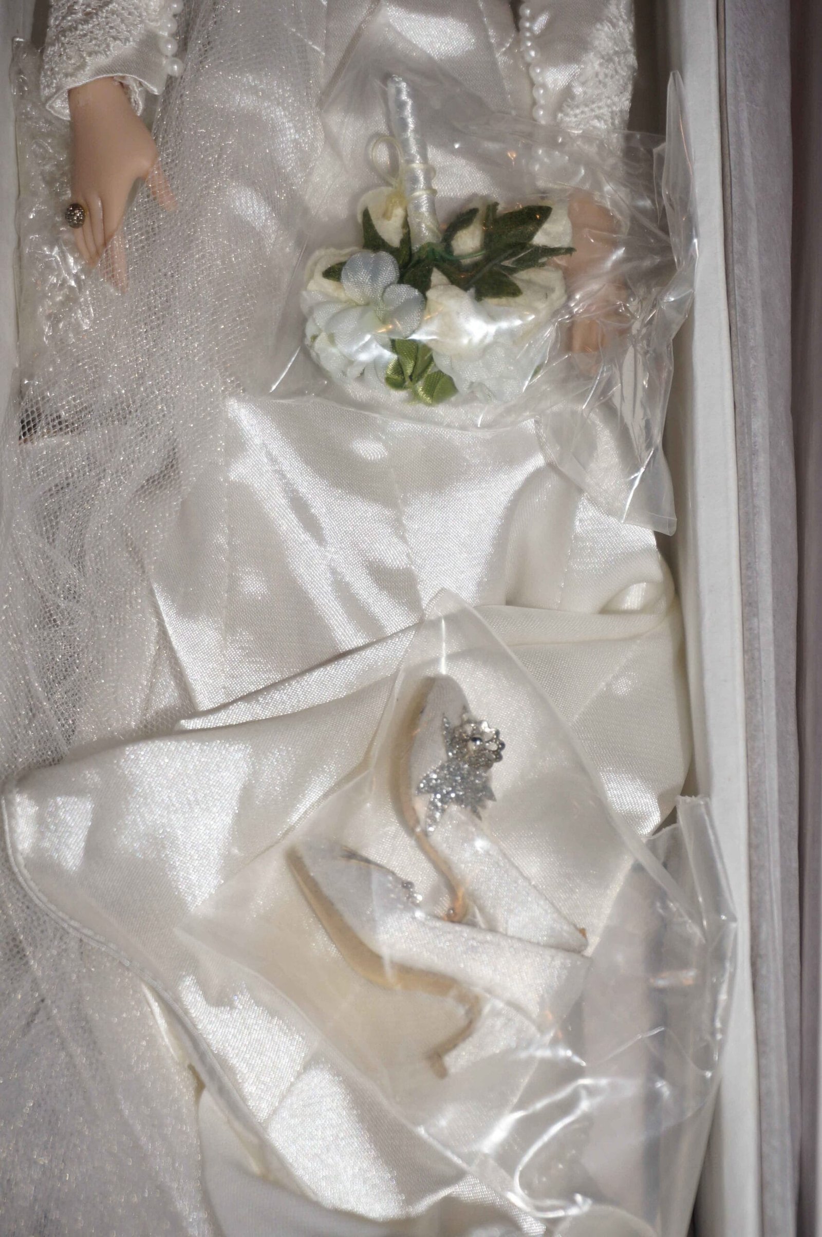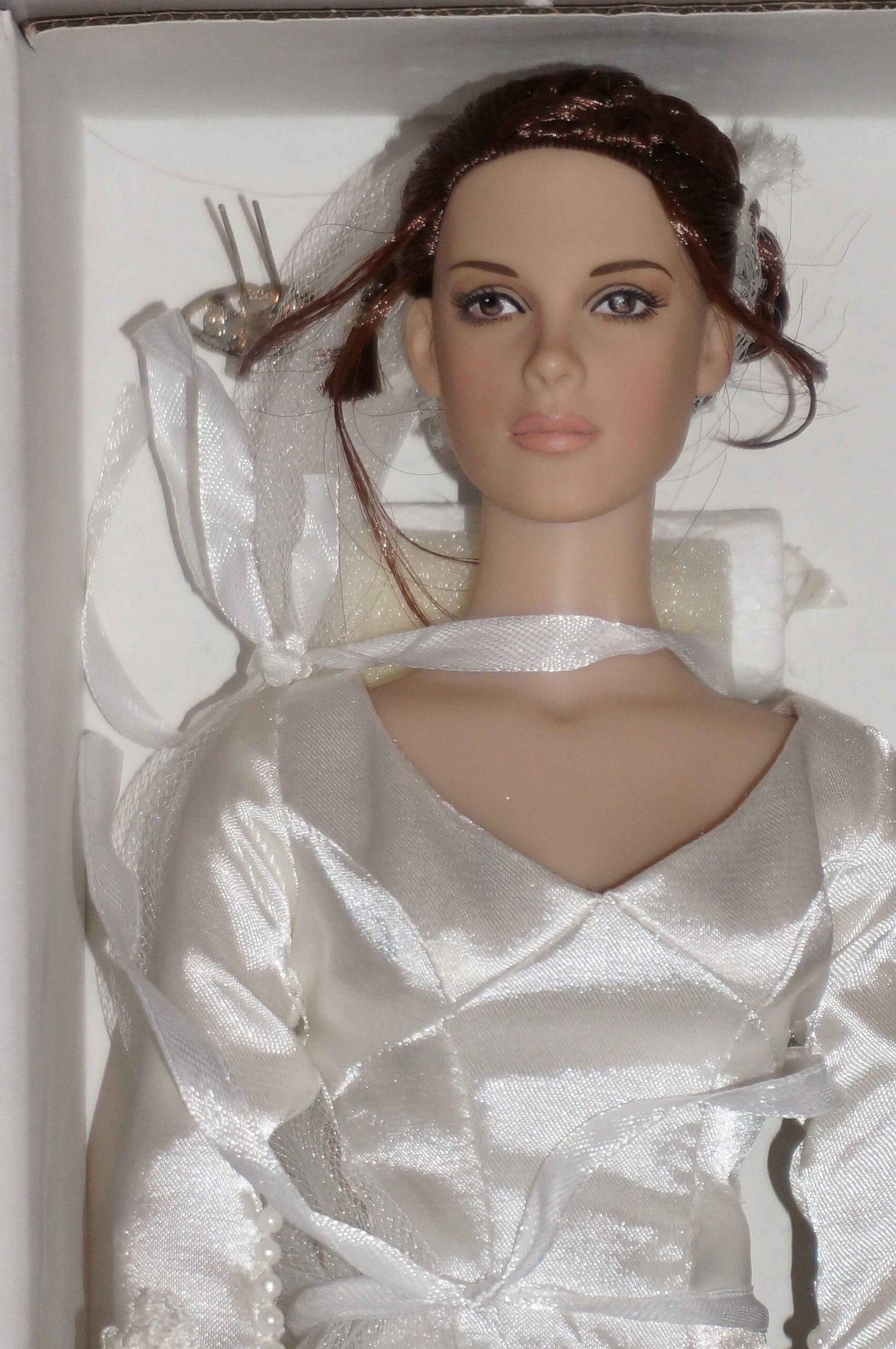 Tonner Bella Cullen doll from the Twilight movies, wearing a beautiful wedding dress and accessories. She comes in the original box with certificate and many of the accessories have never been removed from their pouches. She has her wedding ring. This version of Bella is rare and hard to find.