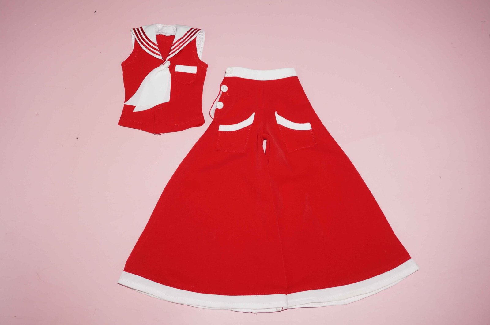 Beautiful outfit from the Virtual Doll Convention for the Grace doll, also fits most other 16 inch dolls.  This is a tailored seaside inspired pants suit with super wide flare pants and a sailor top.  Everything is in very lightweight red and white fabric.  As new condition